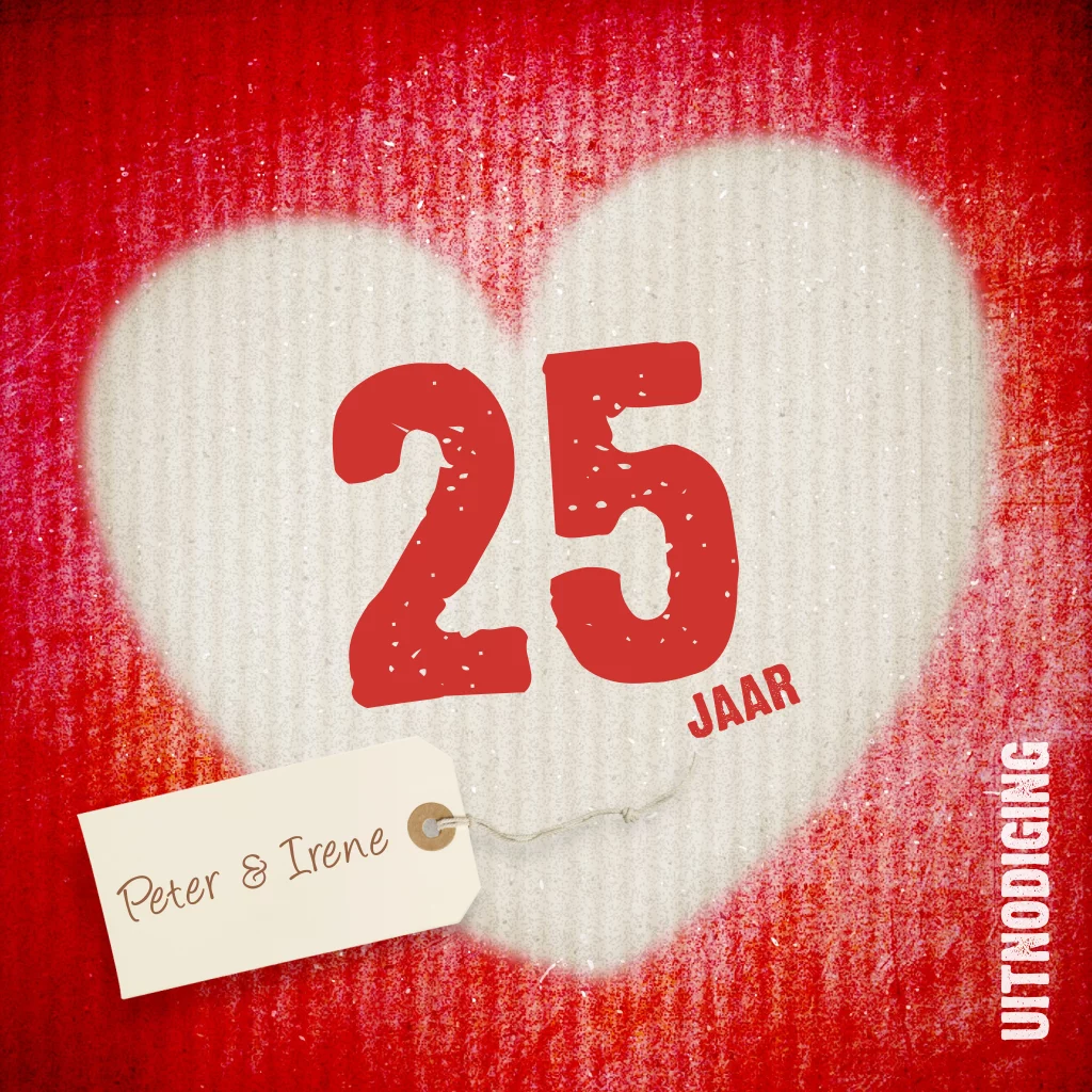 Trendy uitnodiging voor een 25-jarig jubileum. Het jaartal is aanpasbaar. Met groot rood hart en label.