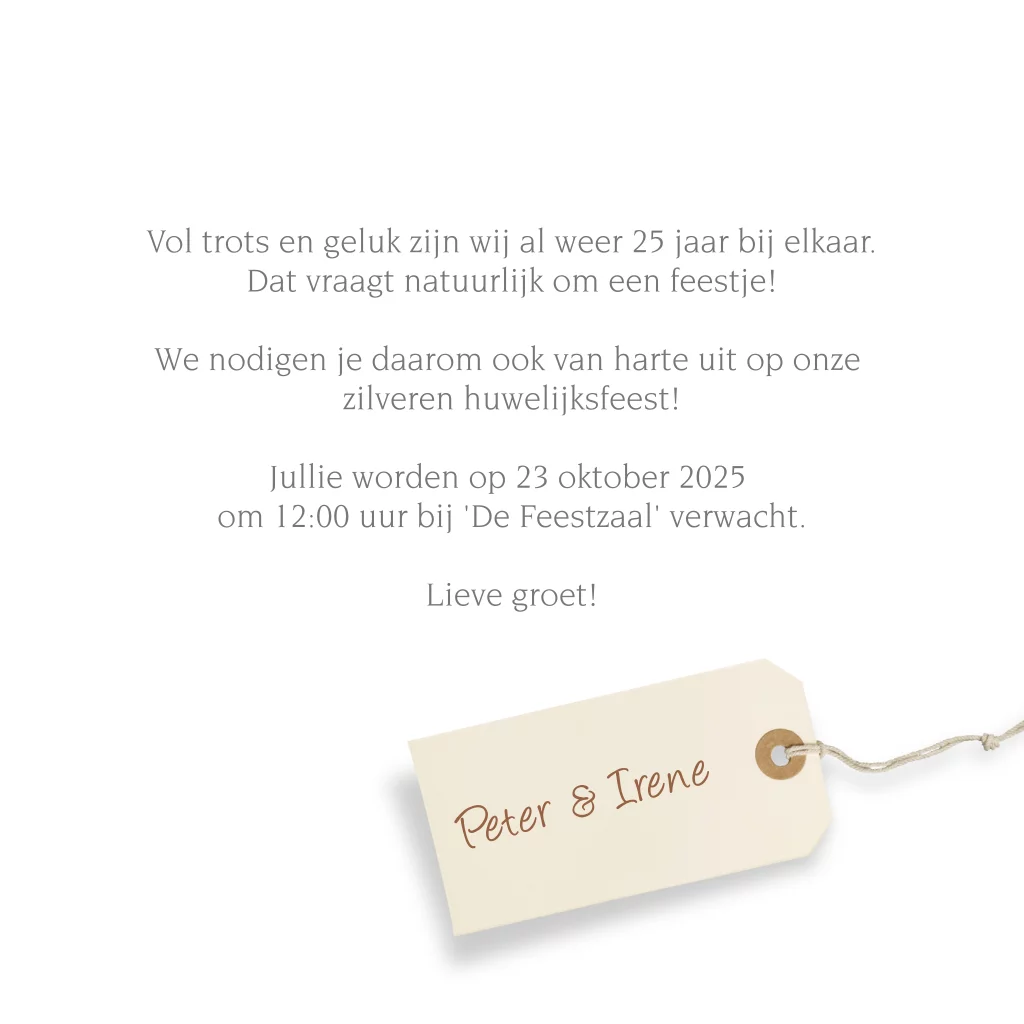 Tijd voor een groot feest! Jullie zijn al weer 25 jaar samen (jaar aanpasbaar) en dat verdient een groot jubileum feest. Stuur deze trendy uitnodigingskaart naar al je familie en vrienden en nodig ze uit voor een onvergetelijke dag. Een groot rood hart met daarin het getal 25 op de voorkant van de uitnodiging, die je kan aanpassen naar ieder gewenst jaartal. Gebruik het labeltje om jullie naam of tekst in te plaatsen en de voorkant is klaar.