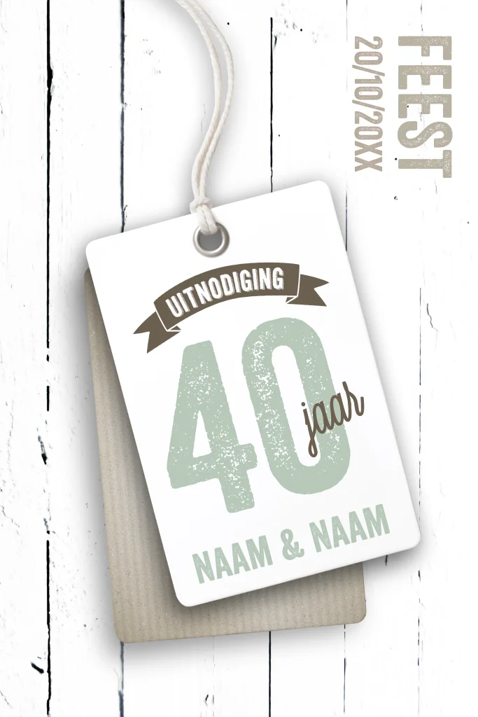 Hippe Uitnodigingen 40 jaar getrouwd jubileum met stoer wit steigerhout en label. Nodig iedereen uit voor een leuk jubileum feest. Plaats het jaartal van jullie jubileum in de label dat ligt op stoer wit steigerhout. Alles is eenvoudig te personaliseren, ook het jaartal.