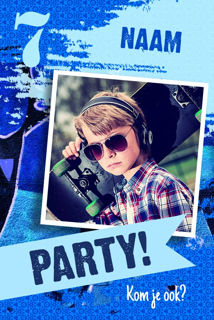 Is de lievelingskleur van jullie zoon blauw? Dan is dit de perfecte uitnodigingskaart voor het feestje van jullie stoere man. Coole lichte en donker blauwe graffiti look, een coole foto van de grote jongen op de voorkant van de uitnodiging. Maak samen een originele uitnodigingstekst voor de Party van het jaar en stuur de uitnodiging naar alle vriendjes!