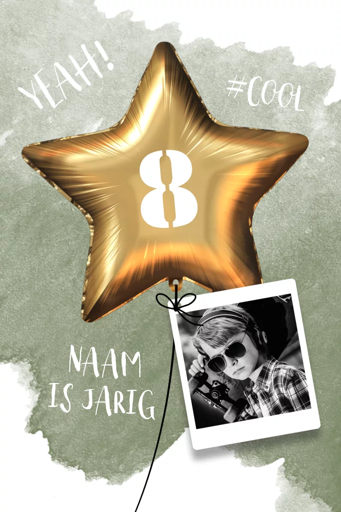 Originele uitnodiging voor een kinderfeestje met Hashtag teksten zoals Cool, Yeah! De leeftijd en je eigen foto op de voorkant. Met stoere groene camouflage achtergrond en een grote gouden ballon op de voorkant.