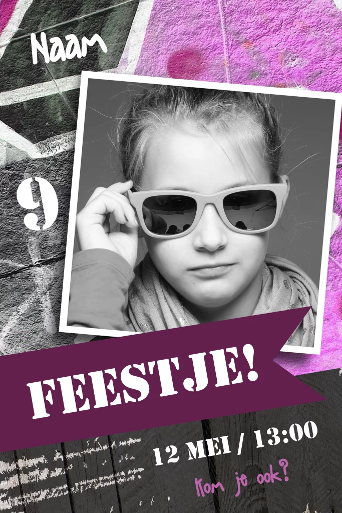 Organiseer een hip meiden feestje voor jullie dochter, maak samen met haar een leuke uitnodiging om al haar vrienden en vriendinnetjes uit te nodigen. Kies een coole eigen foto uit voor op de voorkant van de uitnodiging. Schijf een leuke tekst voor het kinderfeestje en maak samen een unieke uitnodigingskaart voor het leukste feestje van het jaar!
