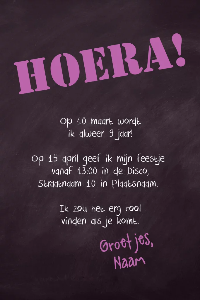 Stoere uitnodiging voor een kinderfeestje van een meisje, met eigen foto, roze graffiti tinten en zwart krijtbord.