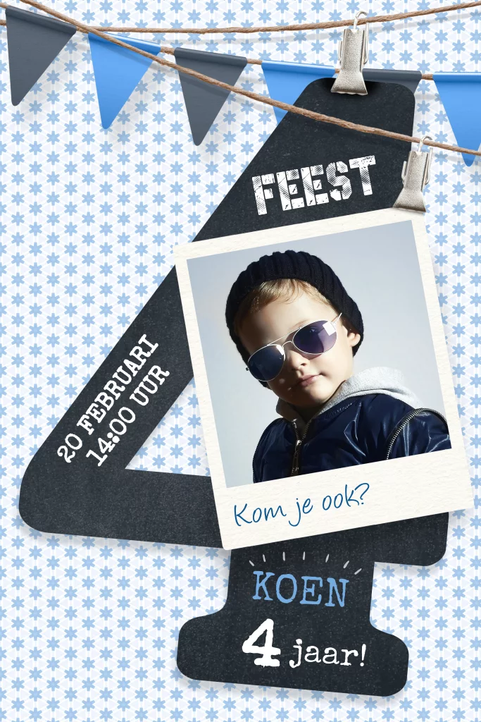 Trendy uitnodiging voor een jongen van 4 jaar die een kinderfeestje geeft. Met foto en slingers. Hippe uitnodigingskaarten voor een kinderfeestje van Luckz.