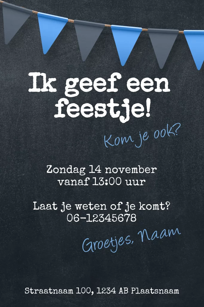 Jullie zoon is bijna jarig dat moet natuurlijk gevierd worden. Maak samen deze trendy uitnodiging. Op de voorkant staat het nummer 4 jaar in zwart krijtbord en voeg een zelfgemaakte foto toe.