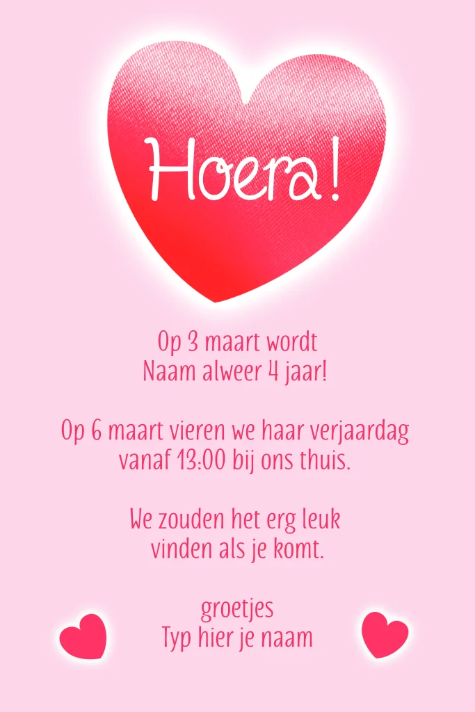 Schattige en lieve uitnodiging voor een kinderfeestje van een meisje met roze hartjes en foto. Lief kaartje van Luckz.