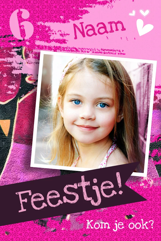 Trendy fel roze graffiti verjaardagsuitnodiging met foto voor een meisje. Hippe uitnodiging voor een kinderfeestje van Luckz.