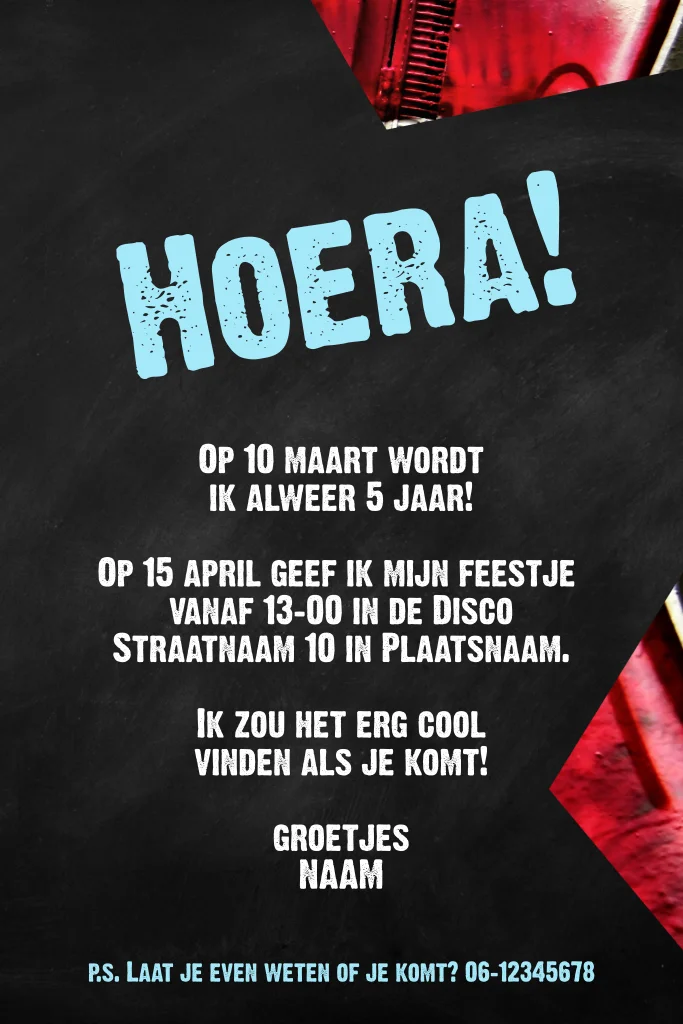 Stoer krijtbord textuur aan de binnenkant met je eigen tekst. Een stoere kinderfeest uitnodiging voor jongens of meiden die van de kleuren rood en zwart houden.