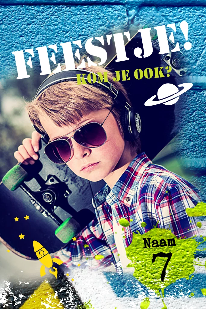 Een stoere uitnodiging voor een feestje van een jongen met blauwe graffiti en een eigen foto. Hippe uitnodiging voor je kinderpartijtje van Luckz.