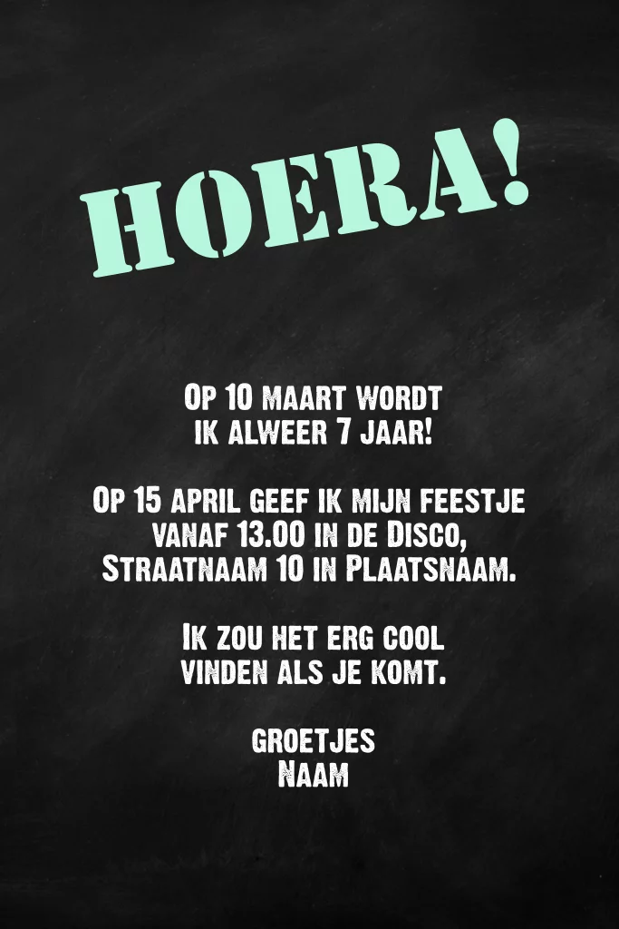 Kies een coole foto en plaats deze op de voorkant van de uitnodiging. Schrijf een leuke tekst en plaats deze op de stoere krijtbord canvas aan de binnenzijde.