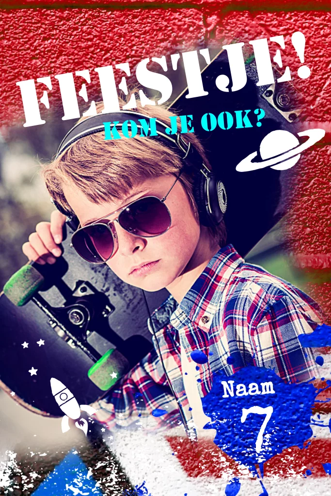 Stoere uitnodiging voor een kinderfeestje in graffiti stijl met coole rode en blauwe tinten.