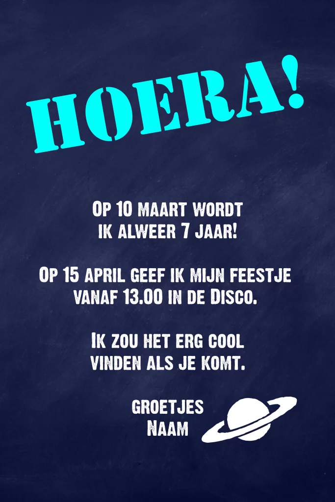 Hip zwart krijtbord aan de binnenkant met lichtblauwe teksten. Trendy uitnodiging van Luckz.
