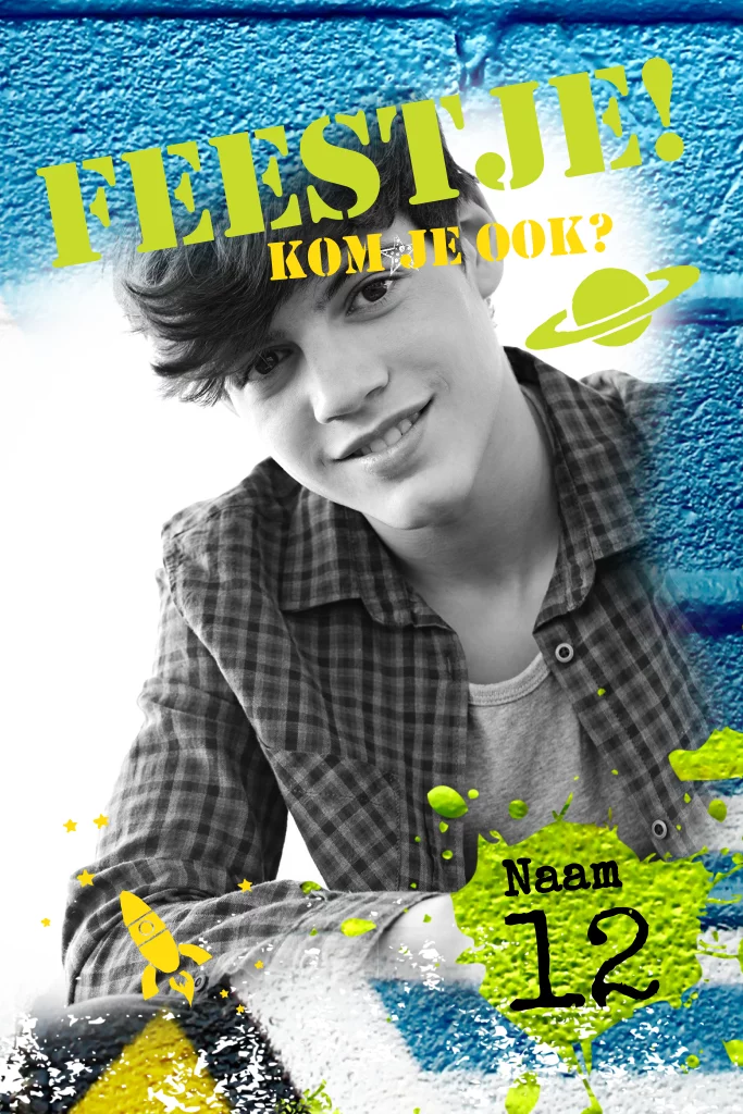 Een super stoere tiener uitnodiging voor een verjaardag van een jongen met hippe lime groen met blauwe graffiti. Cool uitnodigingskaartje van Luckz.
