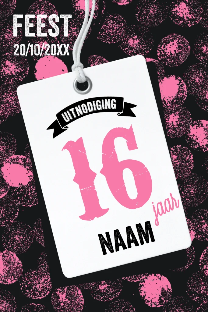 Trendy Sweet Sixteen uitnodigingskaart met roze en label. Hippe uitnodigingskaart van Luckz.