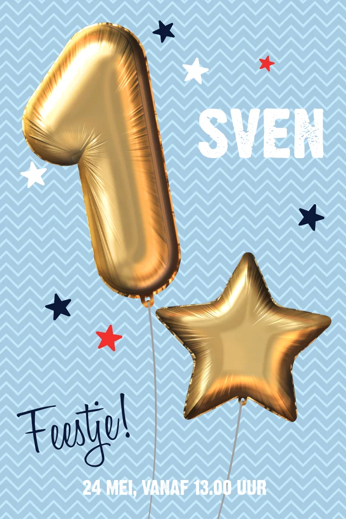 Hoera, hij wordt jarig! Nodig jullie naasten uit met deze leuke en hippe uitnodigingskaart voor een jongen van 1 jaar. De hippe gouden 1 jaar ballon en gouden ster springen van de uitnodiging op de blauwe achtergrond.
