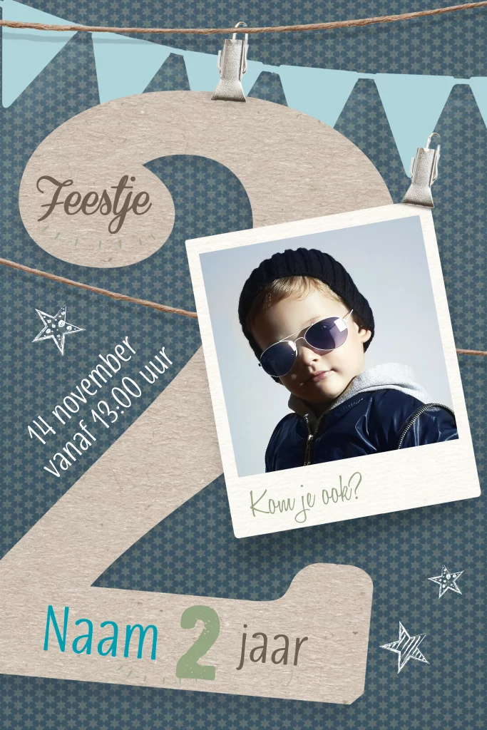 Hippe uitnodigingskaart voor de verjaardag van een jongen van 2 jaar oud met blauwe slingers, karton look twee en eigen foto. Coole uitnodiging voor een kinderfeestje van Luckz.
