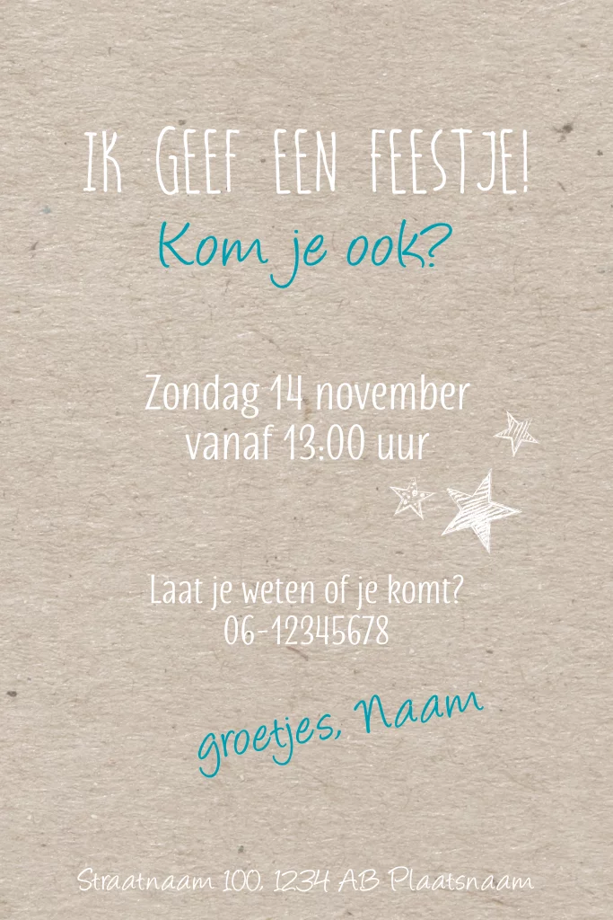 Laat jullie kind stralen op de voorkant van de kaart met een coole foto. De binnenkant heeft een hippe karton textuur waarop je een originele uitnodigingstekst kan schrijven. Maak de uitnodigingen nog stoerder met versieringen in de editor.