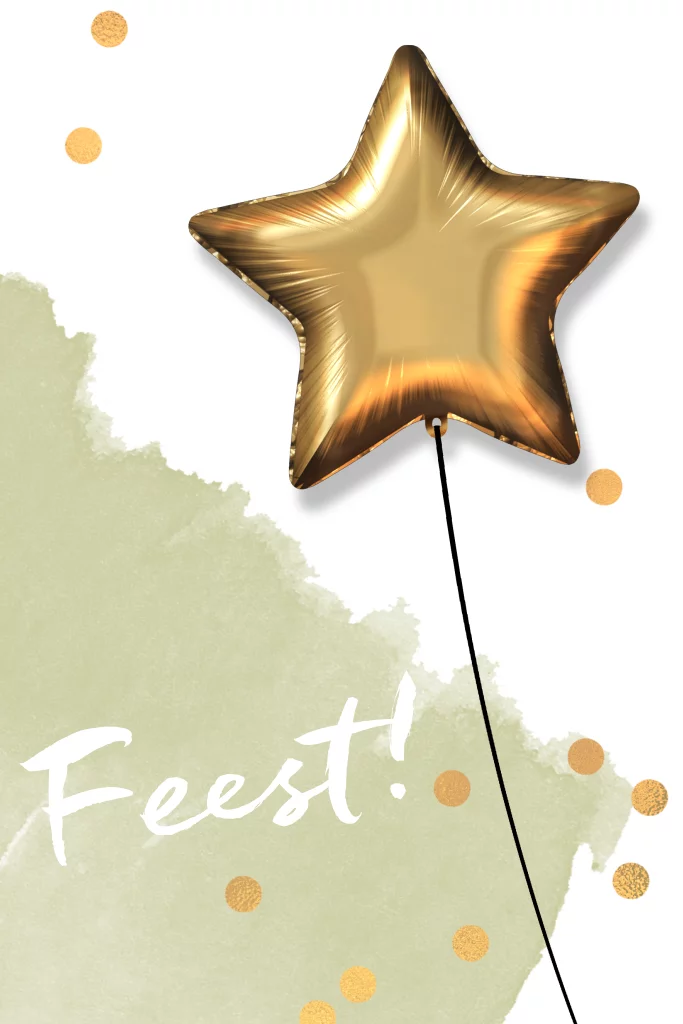 Stoere uitnodiging voor een kinderfeestje van een jongen van 6 jaar. Nodig al je vriendjes uit voor je verjaardagsfeestje met deze hippe kaart met gouden ballon en confetti. Je kan alles aanpassen!