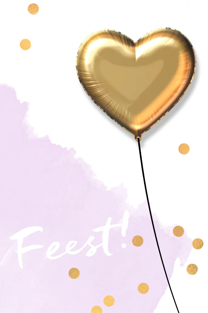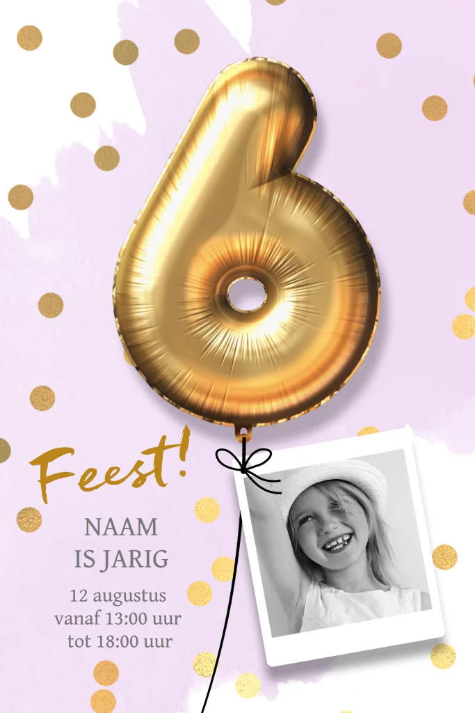 Vrolijke uitnodiging voor een kinderfeestje van een meisje van 6 jaar. Nodig iedereen uit voor je verjaardagsfeestje met deze hippe uitnodigingskaart met gouden ballon en confetti. Pas teksten, kleuren en jaartal aan naar wens.