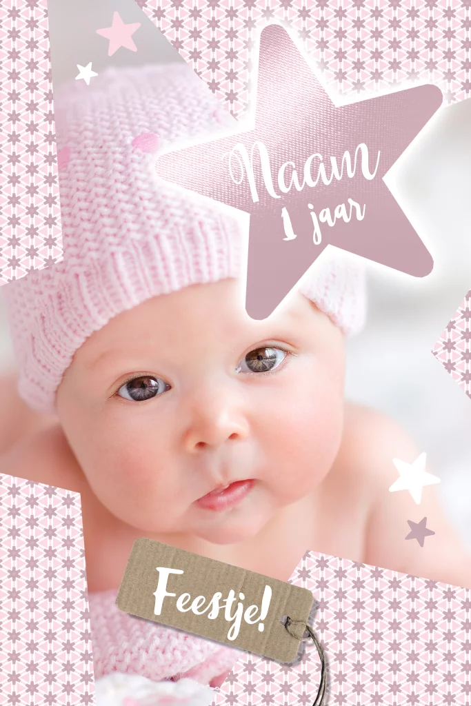 Jullie dochtertje wordt 1 jaar oud! Tijd voor een leuk feestje voor de kleine dreumes. Vrolijke roze sterren in combinatie met zachte roze tinten maken deze uitnodigingskaart speciaal.