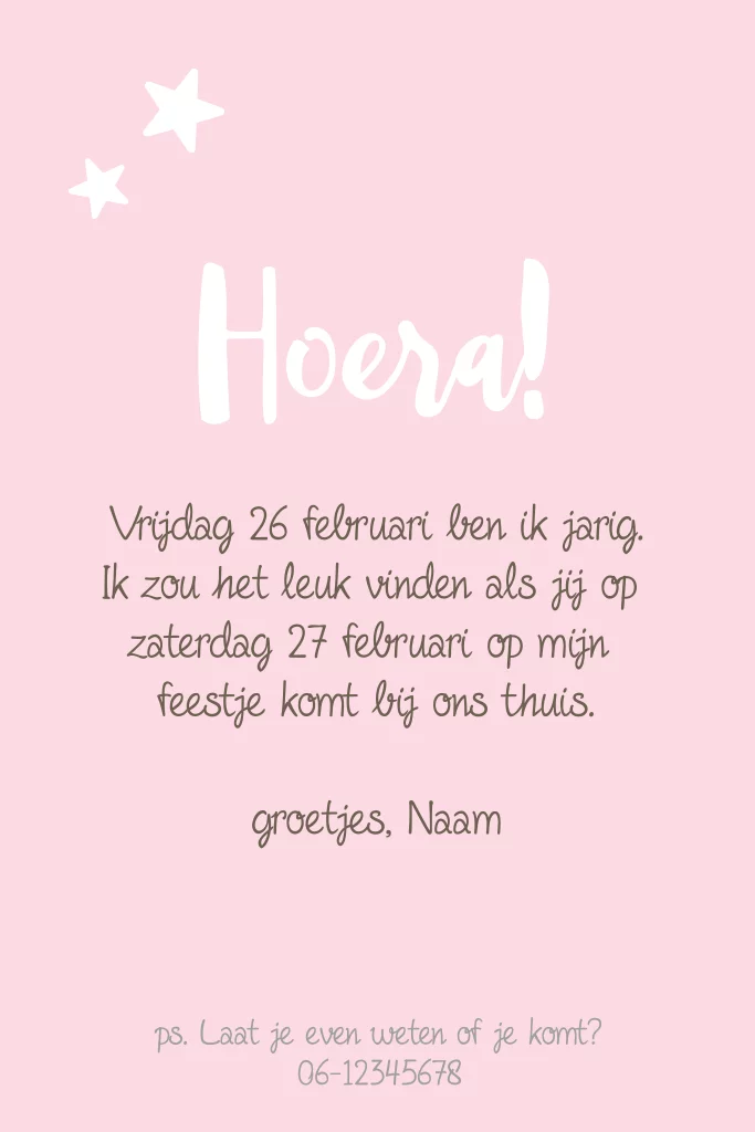 Een leuke foto van de jarige jet op de voorkant van de uitnodiging. Prachtige sterren aan de binnenkant met een unieke en leuke uitnodigingstekst en het feest kan beginnen!