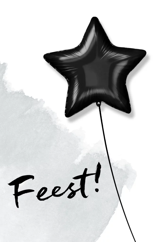 Stoere zwart-witte uitnodiging voor een kinderfeestje van een jongen van 10 jaar. Laat al je vriendjes weten dat er een feestje is! Pas de teksten, ballonnen en kleuren aan naar keuze.