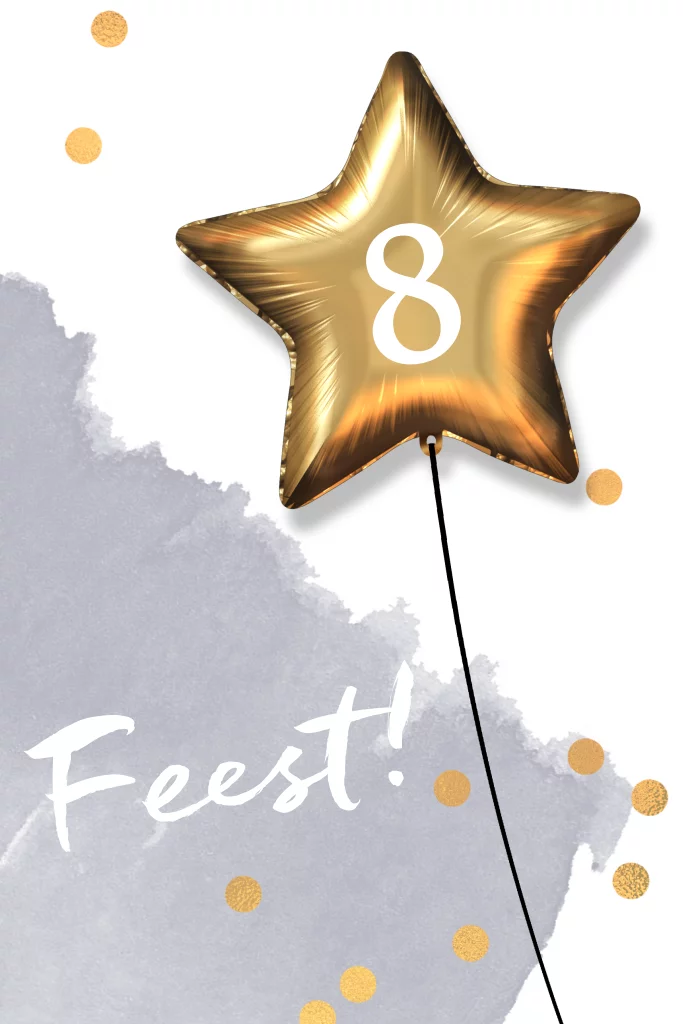 Nodig iedereen uit met deze stoere verjaardag uitnodiging voor je kinderfeestje voor een jongen van acht jaar. Alle kleuren, teksten en het jaartal van de ballon kun je aanpassen!