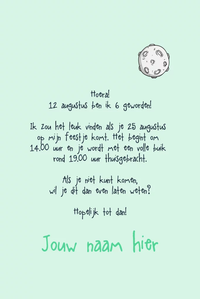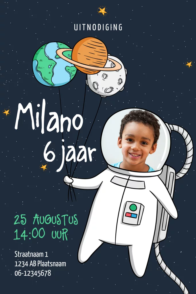 Vrolijke uitnodiging voor een kinderfeestje. Met een leuke illustratie van een astronaut met je eigen foto gezicht, rondom leuke sterren en planeten als ballonnen in de ruimte. Schrijf je eigen teksten en zet je foto op deze uitnodiging voor je kinderpartijtje.