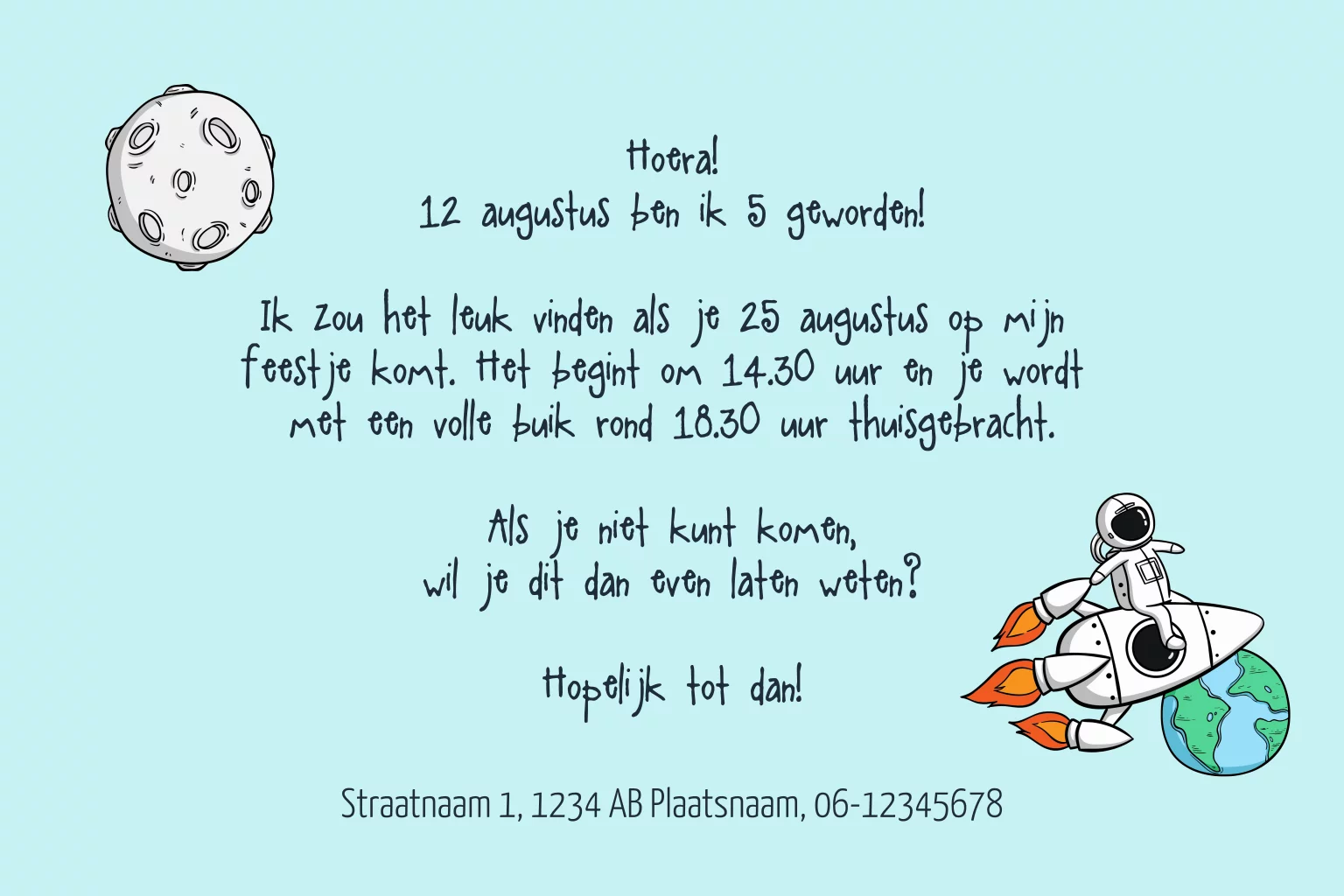 Stoere uitnodiging voor een kinderfeestje met een illustratie van een astronaut in de ruimte en je eigen foto op de voorkant in de astronaut. Rondom zie je de maan, de aarde en de zon en leuke sterren. Alle teksten kun je zelf aanpassen.