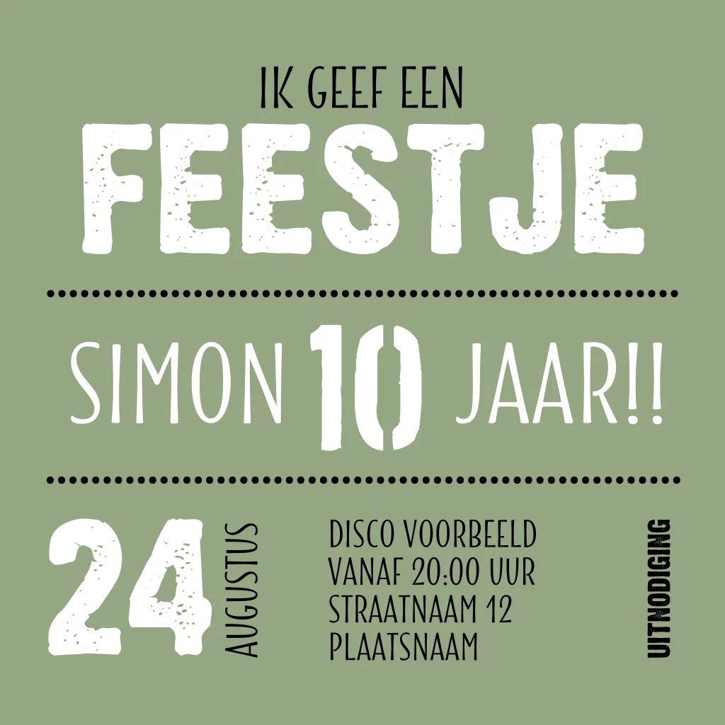 De verjaardag van jullie zoon komt er alweer aan! Ontwerp samen een leuke uitnodigingskaart en maak er één groot kinderfeestje van. Met hippe typografie en leger groene tinten.