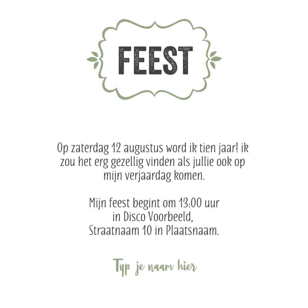 Groot op de voorkant van de kaart, mooie groene tinten als achtergrond. Aan de binnenzijde van de uitnodiging is ruimte voor informatie over het feestje.