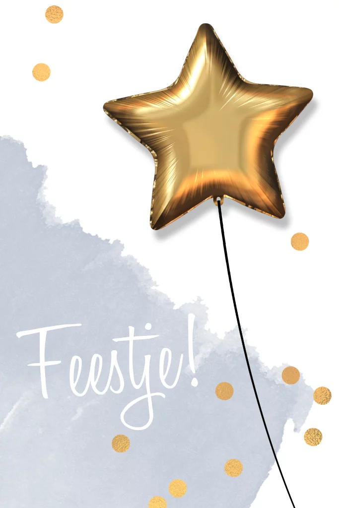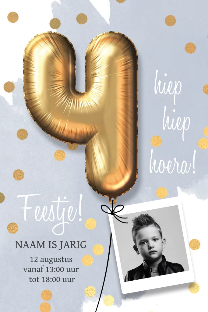 Stoere verjaardag uitnodiging voor een jongen van vier jaar met grijze verf vegen tinten en een mooie gouden ballon. Kleuren, teksten en het cijfer van de ballon zijn aanpasbaar!