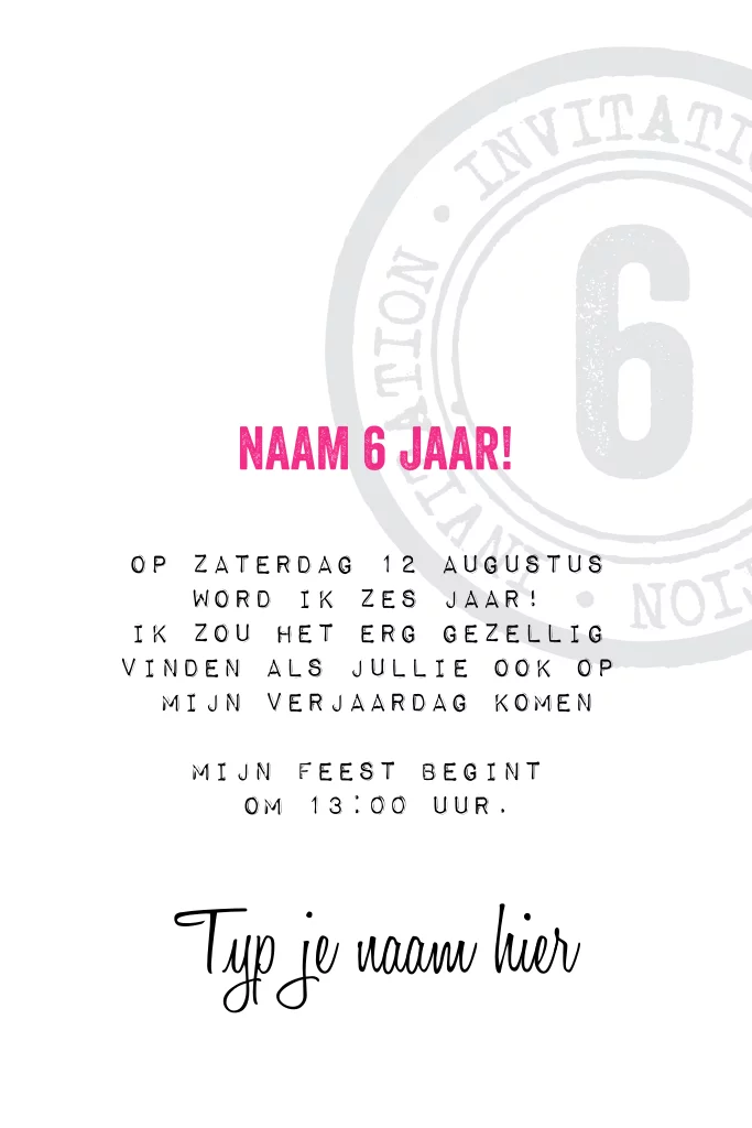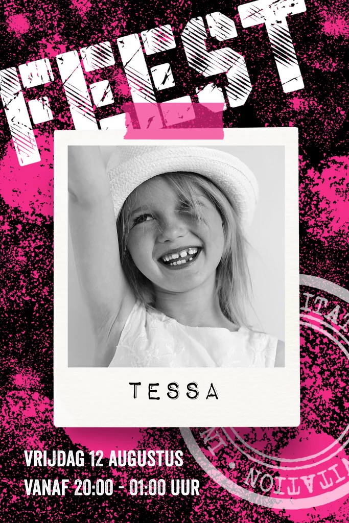 Stoere uitnodigingen voor een kinderfeest met foto, roze en zwarte tinten. Hip uitnodigingskaartje van Luckz.