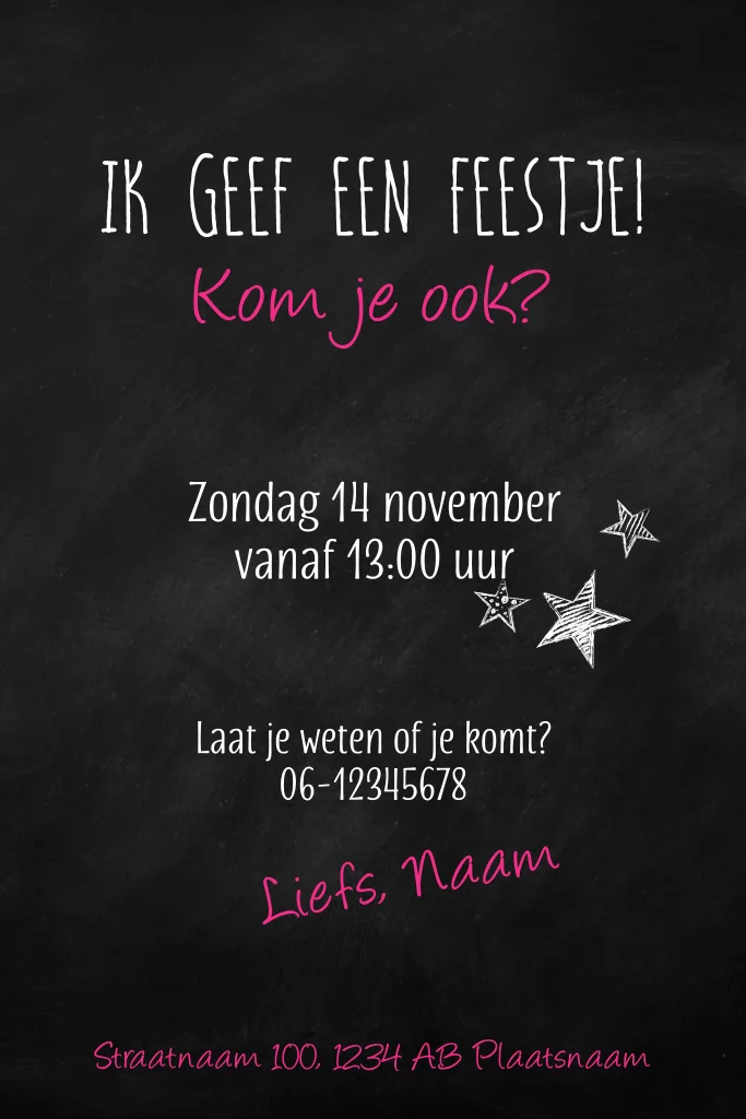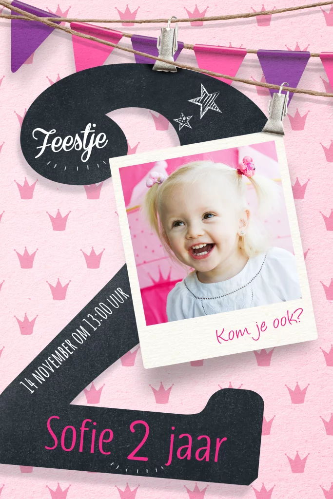 Uitnodiging voor de verjaardag van een meisje van 2 jaar met eigen foto, roze slingers en zwart krijtbord. Hippe uitnodigingen voor kids van Luckz.