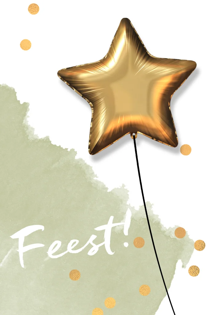 Met hippe groene verf tinten en gouden cijfer ballonnen. Pas zelf de kleuren en teksten aan en voeg zelf een leuke foto in kleur of zwart-wit toe.