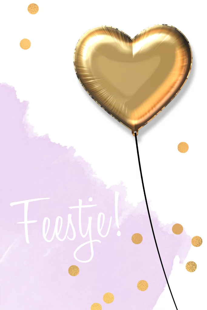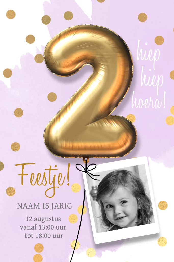 Leuke vrolijke uitnodiging voor de verjaardag van een meisje van twee jaar met een gouden ballon. De ballon is aanpasbaar met de beeldbank.