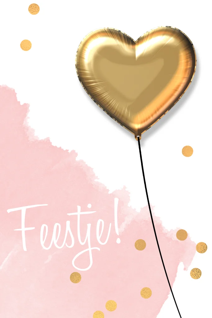 Hippe uitnodiging kinderfeestje voor een verjaardag van een 5-jarig meisje van vijf jaar. Met gouden ballon en confetti. Kleuren, teksten en cijfer zijn aanpasbaar!
