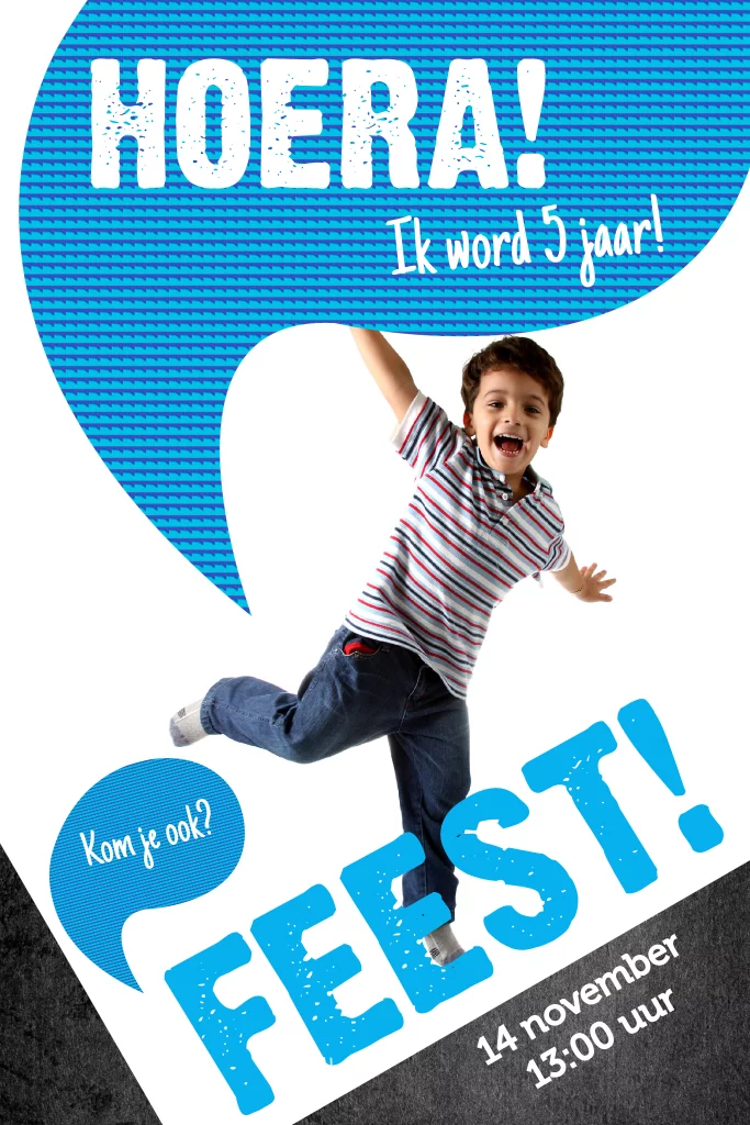 Hip krijtbord rondom de kaart en aan de binnenzijde in het groot "FEEST" Maak nog een leuke foto voor aan de binnenkant van de uitnodiging en plaats deze onder de grote blauwe tekst bubbel. Je kunt de tekst en foto's aanpassen met de editor.