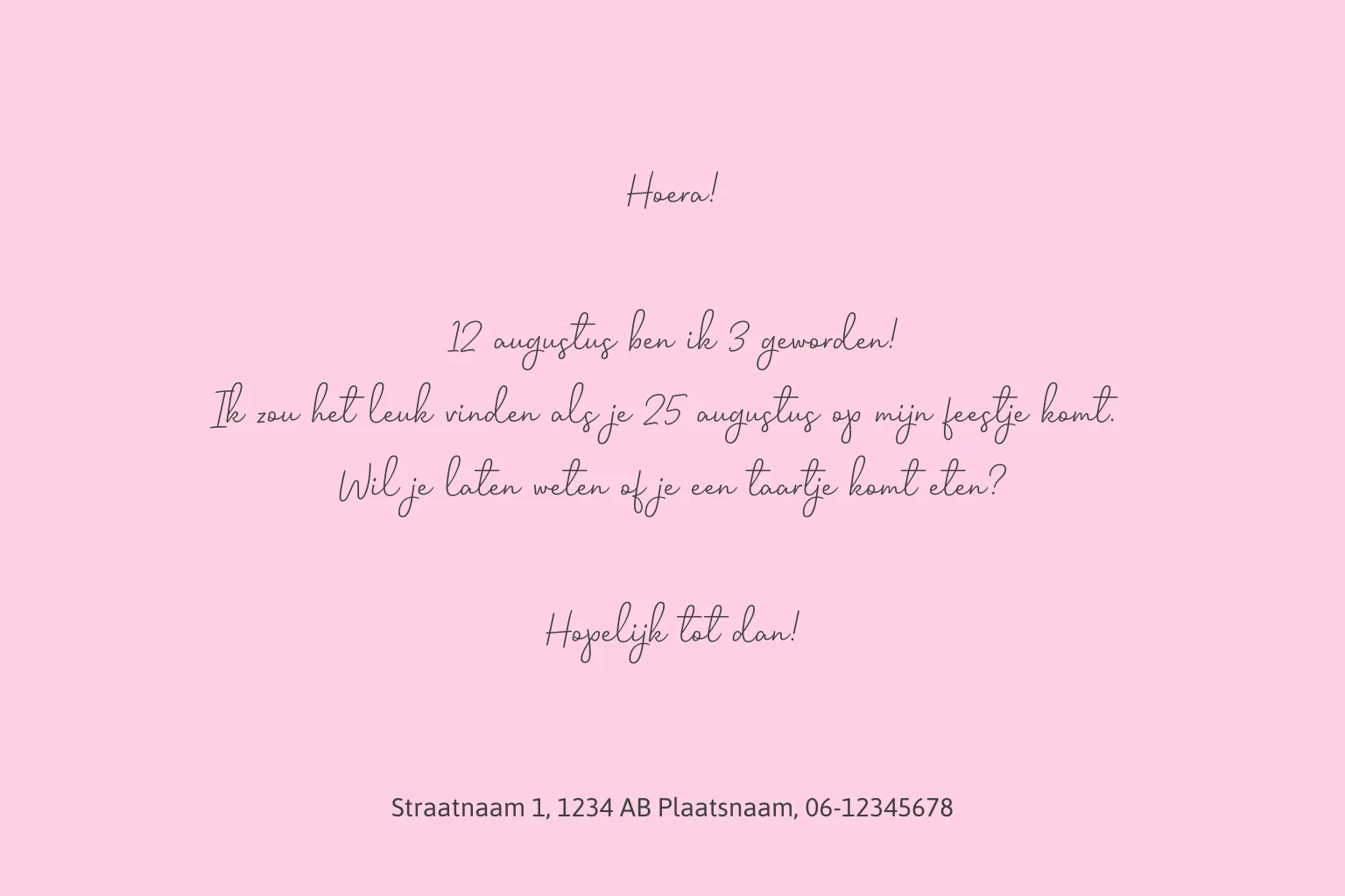 Zet je eigen foto op de kaart, plaats de feestmuts op de foto van de jarige. Pas de naam op de voorkant aan, kies je eigen kleuren, bijvoorbeeld van roze naar blauw. En schrijf je uitnodigingstekst in de binnenkant.