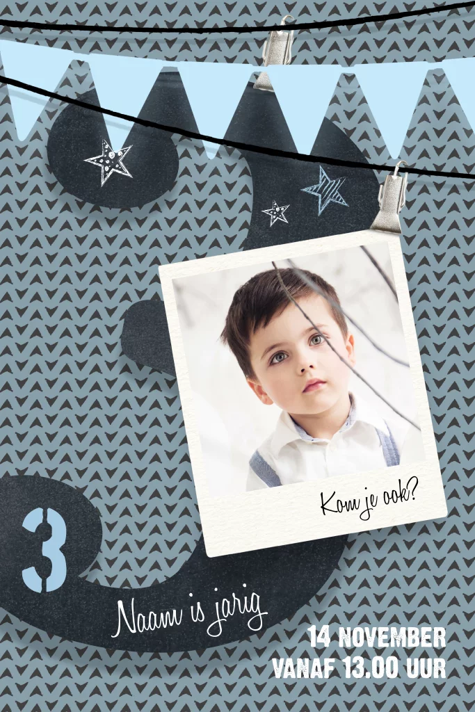 Unieke uitnodiging voor de verjaardag van een jongen van 3 jaar met een hip patroontje, slingers en een eigen foto. Trendy uitnodigingskaarten voor kids van Luckz.