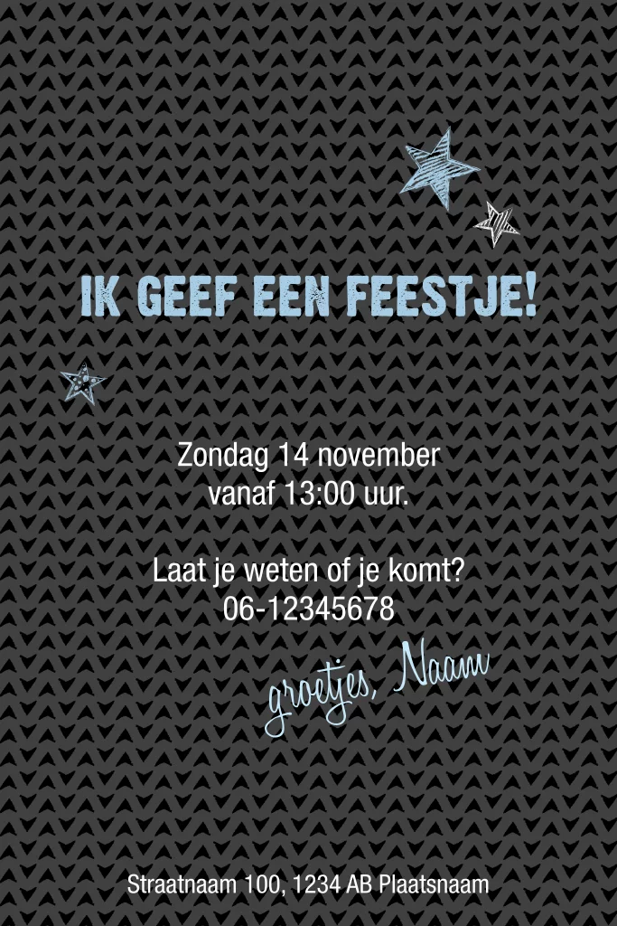 Een hip blauw zwart patroontje op de achtergrond, vrolijke lichtblauwe slingers en een stoere zwarte krijtbord drie maken deze uitnodigingskaart voor de verjaardag van een 3-jarige jongen heel origineel. Maak een leuke foto en laat de dreumes stralen op de voorkant van de uitnodiging. Schrijf een leuke uitnodigingstekst in de binnenkant en het feest kan beginnen!