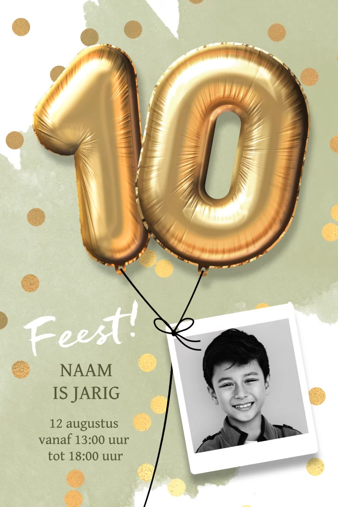 Stoere uitnodiging voor de verjaardag van een jongen van tien jaar. Met hippe groene verf vegen en gouden cijfers (aanpasbaar met de editor).