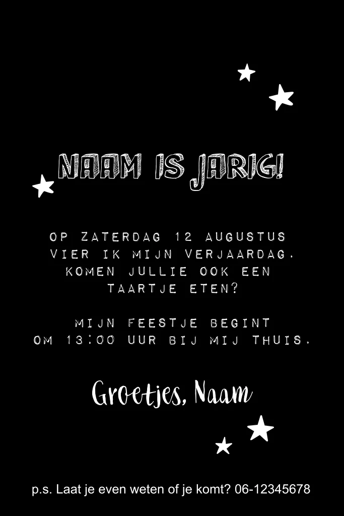 Jullie kleine bink wil een stoer feestje? Een hippe zwarte ballon met zijn leeftijd erin, een eigen leuke of gekke foto onder de ballon. De binnenkant van de kaart kunnen jullie geheel naar eigen smaak invullen met gebruik van de editor. Maak er samen een leuke dag van!