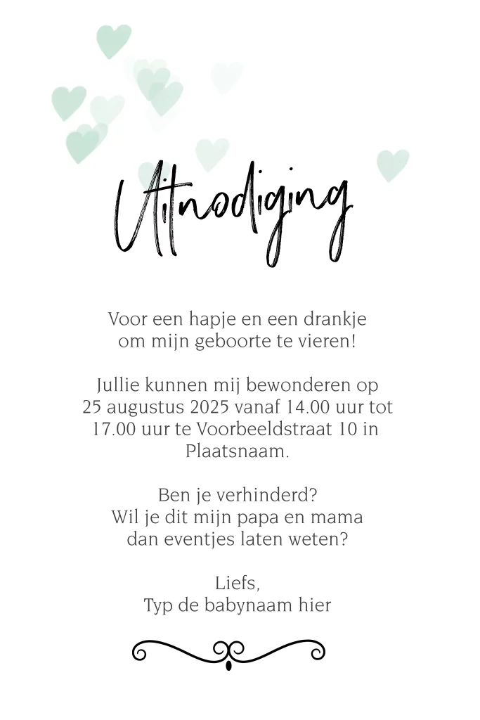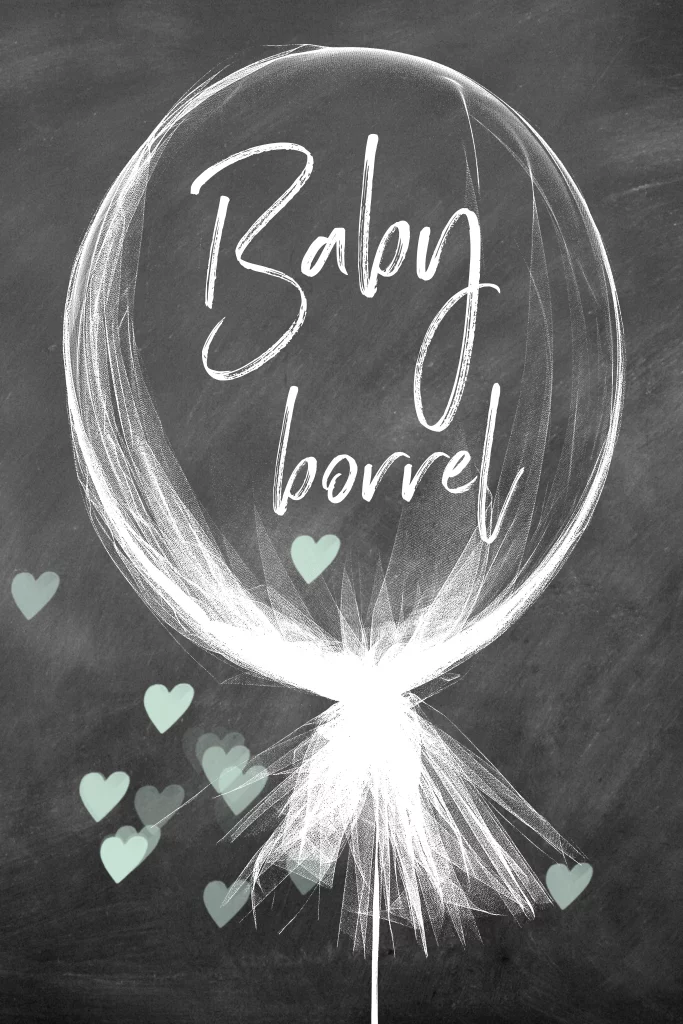 Een leuke hippe babyborrel uitnodiging met krijtbord look ondergrond en mint groene hartjes en witte ballon.