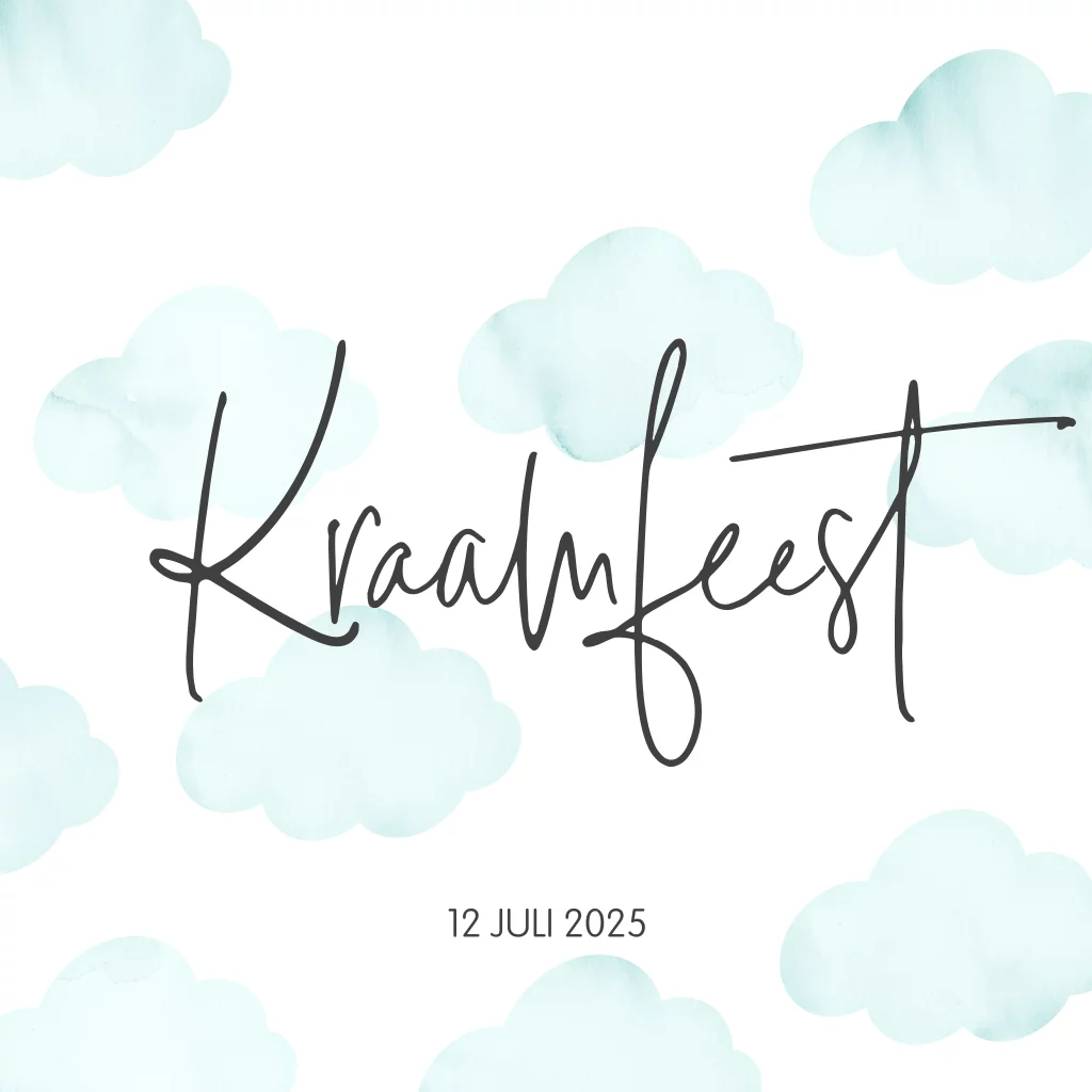 Lieve uitnodiging voor een kraamfeest met kleine mint groene waterverf wolkjes op een witte achtergrond. Zelf maken bij Luckz.