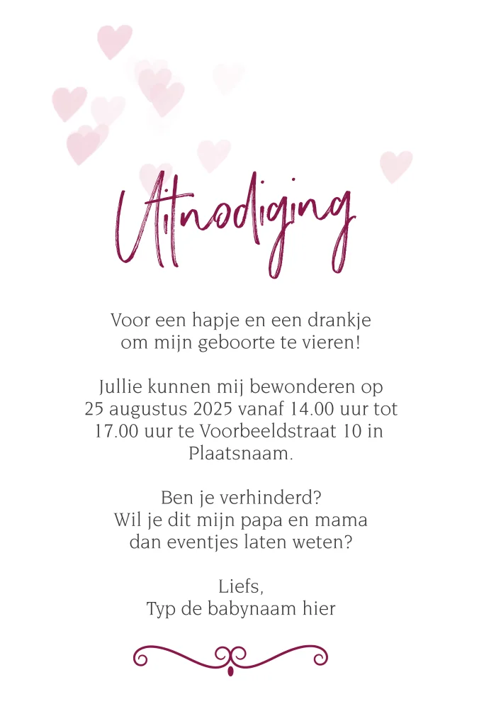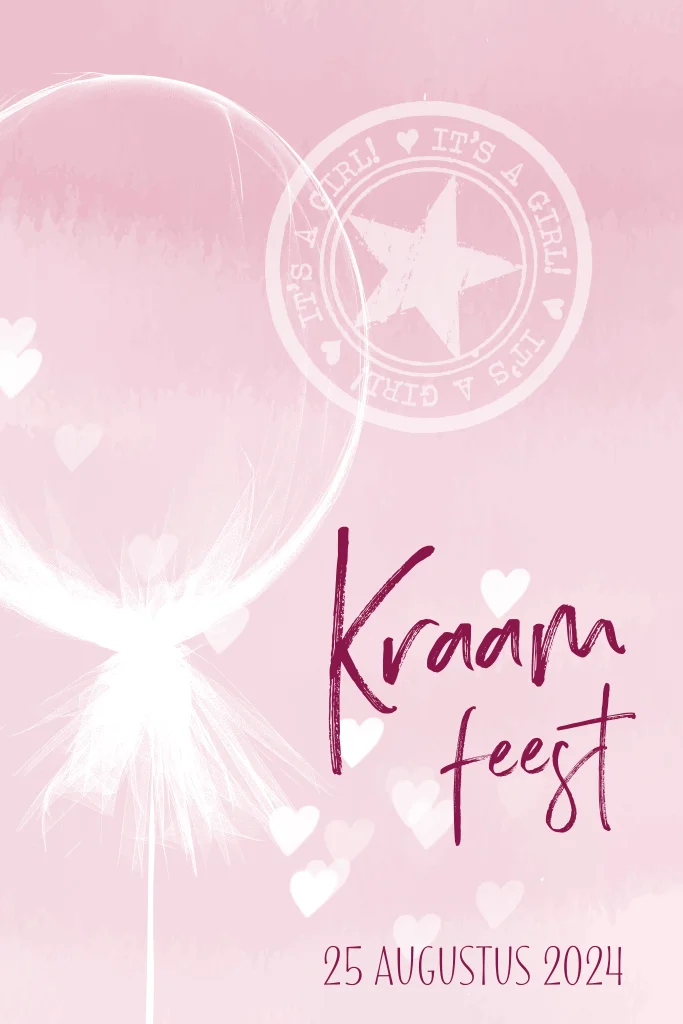 Mooie roze kraamfeest uitnodiging met aquarel waterverf achtergrond en witte feestelijke elementen. Zelf te personaliseren bij Luckz.