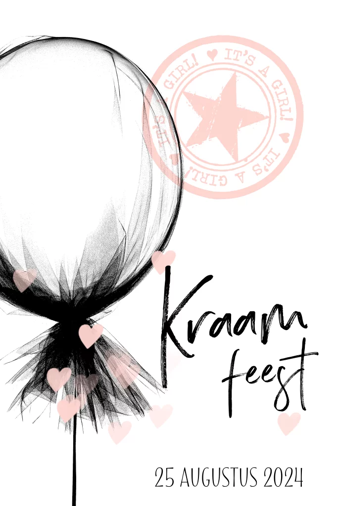 Een mooie en stijlvolle kraamfeest uitnodiging met een illustratie van een doorzichtige ballon en kleine lieve roze hartjes en stempel.