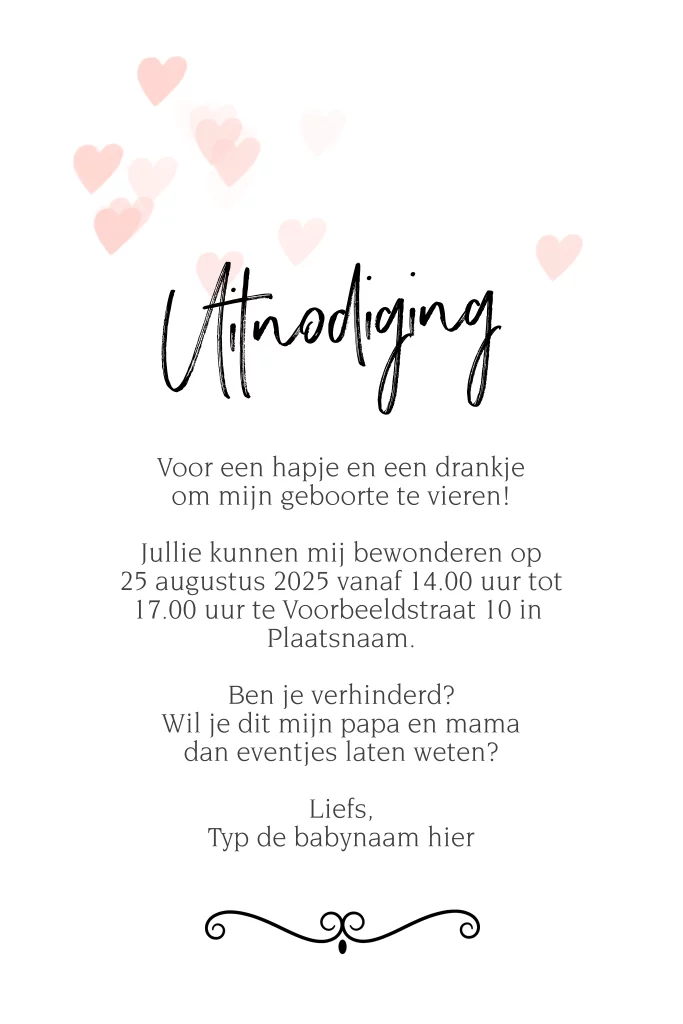 Geef je een babyborrel? Pas de teksten van de kraamfeest uitnodigingen eenvoudig aan in de editor.