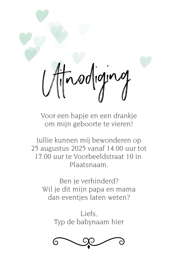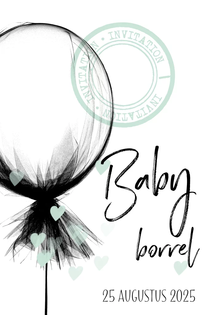 Ga je een babyborrel of kraamfeest organiseren? Stuur dan deze stijlvolle uitnodiging naar alle vrienden en familie. Met een stijlvolle doorzichtige zwarte ballon en lieve kleine hartjes op de voorkant.