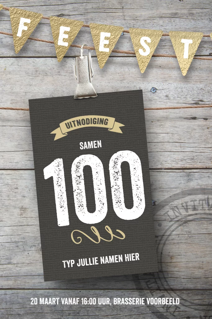 Maak deze hippe uitnodiging als jullie allebei 50 jaar worden en een "samen 100 jaar verjaardag vieren"! Met feestelijke gouden vlaggetjes, een krijtbord label op een hout look ondergrond.